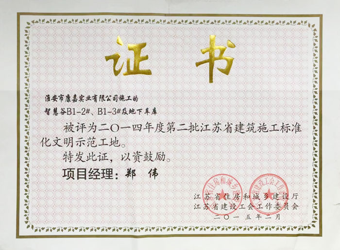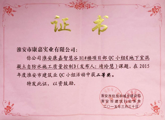 2015年淮安市建筑業(yè)QC小組活動(dòng)二等獎(jiǎng)
